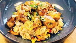 Stegte ris med kød og grøntsager er en nem ret, og inspireret af asien, hoisinsaucen giver en skøn smag af...