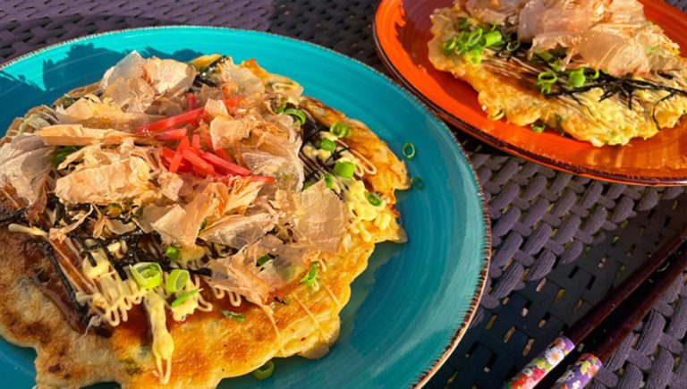 Hvad Er Okonomiyaki, og Hvordan Fremstilles Det? Okonomiyaki er en japansk pandekage fyldt med kål, kød eller skaldyr. Dejen steges på panden og serveres med okonomiyaki-sauce og bonito-flager.