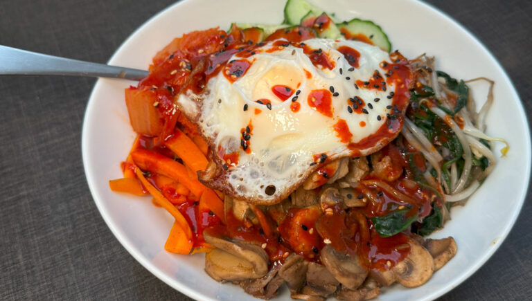 - Bibimbap: En farverig risret toppet med grøntsager, kød og spejlæg.