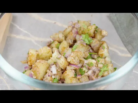 Kog kartoflerne møre, skær dem i tern, og bland med løg, koriander, krydderier og salt. Stil blandingen til side.