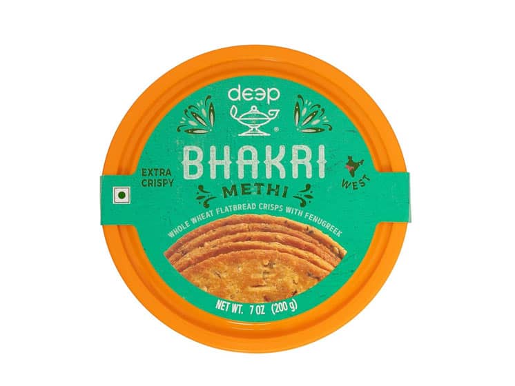 Bhakri Methi er en traditionel, sprød indisk fladbrødssnack lavet af fuldkornsmel og tørrede bukkehornsblade (methi). Den har en karakteristisk krydret og aromatisk smag, som gør den perfekt som snack, tilbehør til te eller som ledsager til chutney, yoghurt eller indiske retter.