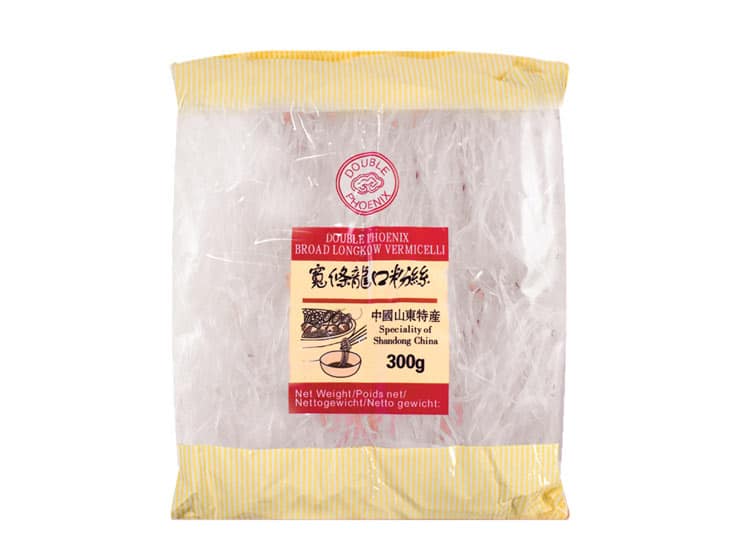 Double Phoenix Broad Longkow Vermicelli er klassiske kinesiske glasnudler i en bred udgave, fremstillet af mungbønnestivelse. De er kendt for deres gennemsigtige udseende, elastiske struktur og evne til at absorbere smag, hvilket gør dem ideelle til både varme og kolde retter.