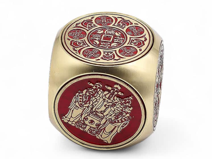 Denne Feng Shui velstandsterning er fremstillet i massiv messing med røde detaljer og dekoreret med traditionelle kinesiske symboler og tegn. Designet er inspireret af klassisk Feng Shui-æstetik og kombinerer et tidløst formsprog med et eksklusivt finish, der gør terningen velegnet som både dekoration og gave.