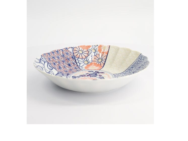 Designet er inddelt i sektioner, hver med sit eget klassiske japanske mønster: blomster, skyer, bølger og geometri smelter sammen i et harmonisk patchwork. Den let bølgede kant og det keramiske udtryk gør skålen både funktionel og dekorativ, og den flade bund gør den stabil på bordet.