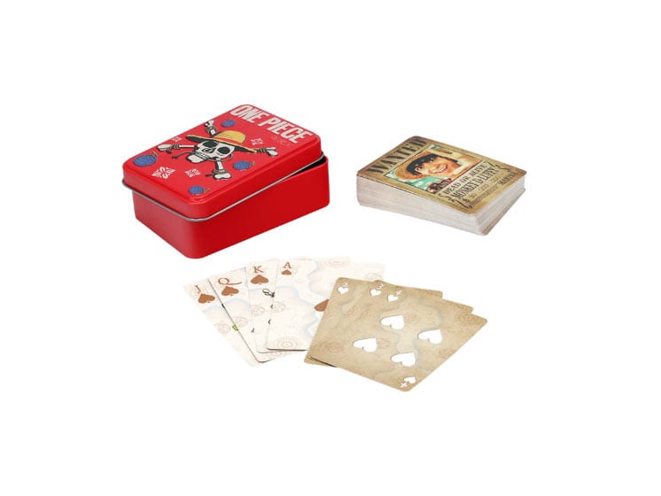 Spillekortene er dekoreret med motiver inspireret af One Piece-universet, herunder de ikoniske Wanted-plakater, som fans af serien straks vil genkende. Den medfølgende metalæske beskytter kortene og gør det nemt at opbevare dem eller tage dem med på farten.