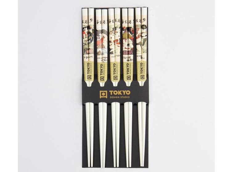Dette sæt består af fem spisepinde dekoreret med klassiske japanske Shunga-motiver. Stilen er inspireret af traditionelle trætryk og illustrerer den karakteristiske æstetik fra Edo-periodens kunst. Spisepindene kombinerer dekorativt håndværk med praktisk anvendelighed og giver et markant og karakterfuldt element til enhver borddækning.