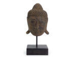 Buddha-hovedet er monteret på en solid sort træfod, som giver stabilitet og løfter figuren visuelt, så den fremstår som et naturligt fokuspunkt. Små variationer i struktur og nuance er en del af det håndlavede udtryk og gør hver statue unik.