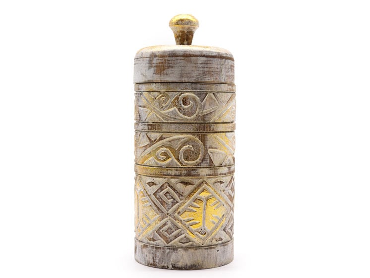 Den høje, cylinderformede silhuet gør krukken ideel som blikfang på hylder, borde eller i vindueskarme. Kombinationen af hvid og guld passer perfekt ind i både moderne, boheme- og etnisk inspirerede hjem.